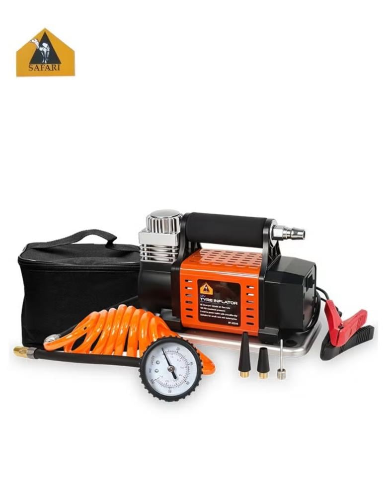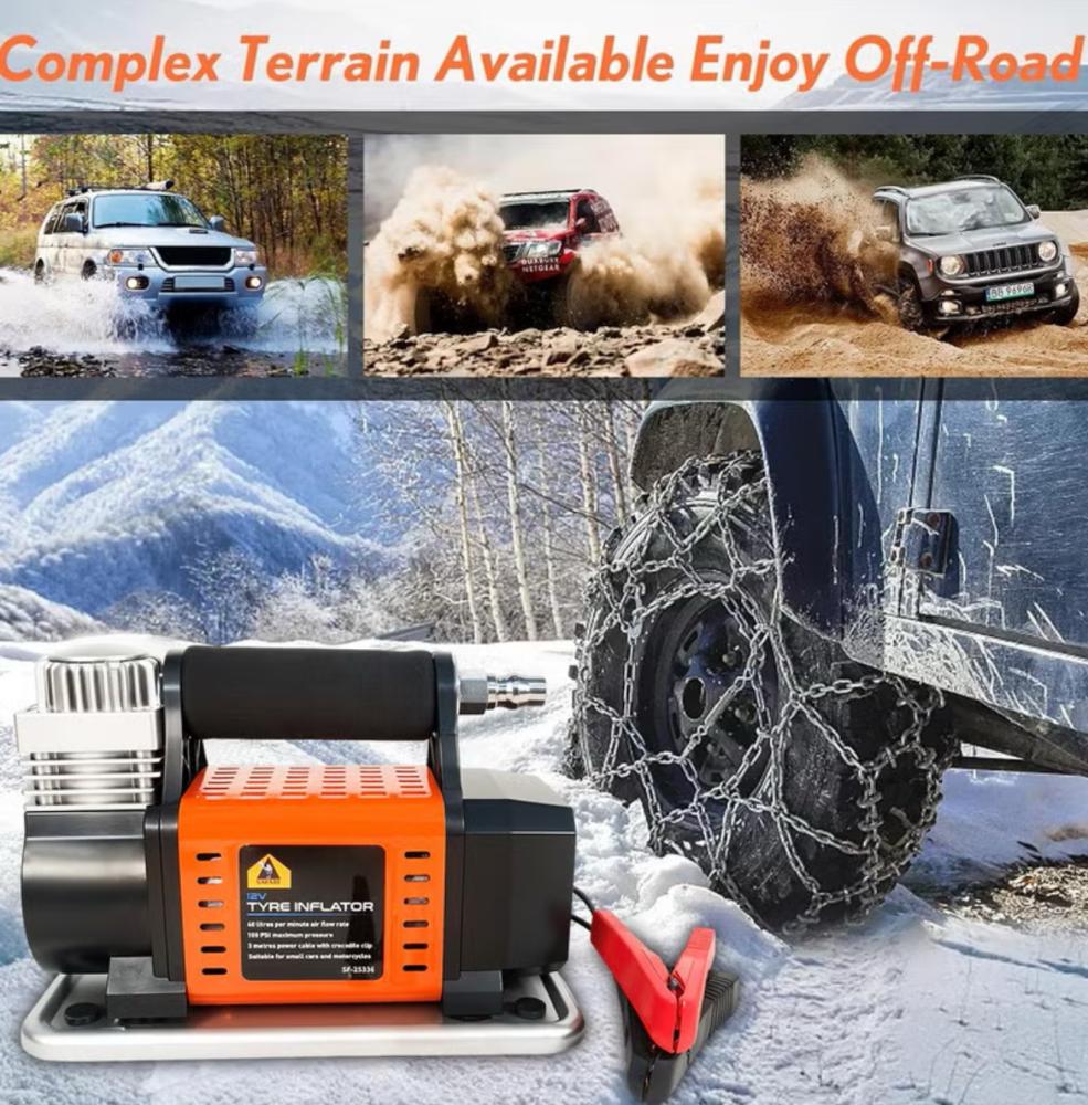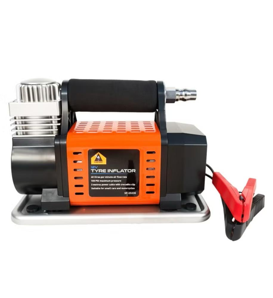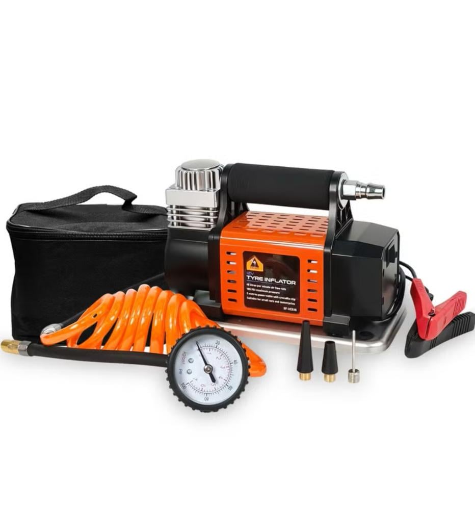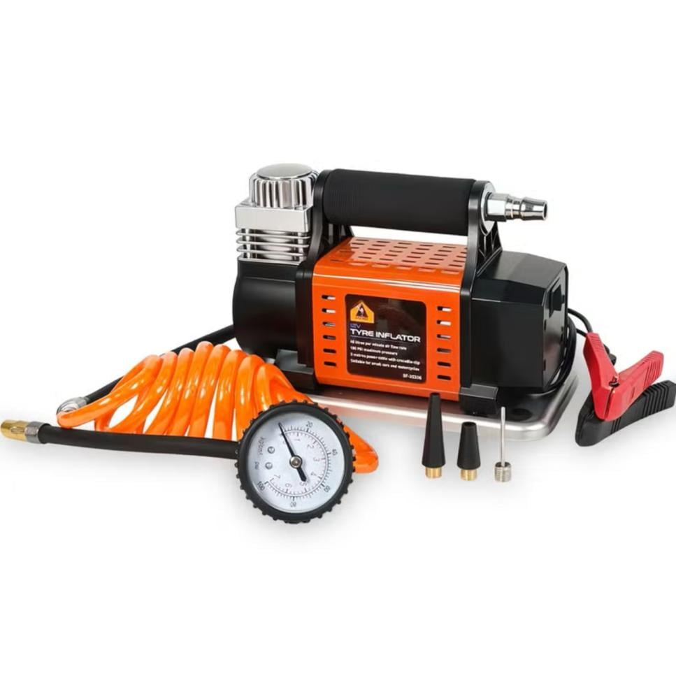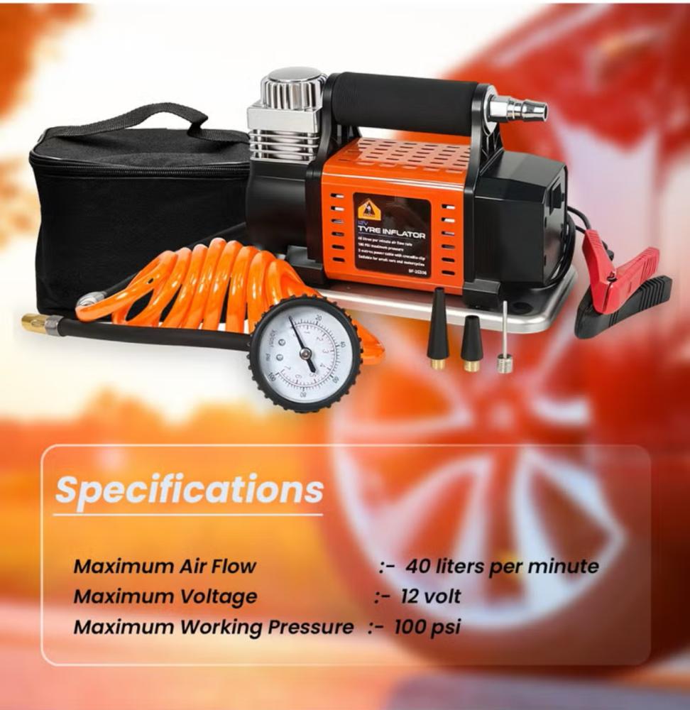 كمبروسر هواء قوي بجهد 12 فولت وسرعة تدفق تصل إلى 40 لتر/دقيقة وضغط يصل حتى 100 PSI، مناسب لنفخ كفرات السيارات، الجيوب، الدراجات وحتى الكرات والمسابح.