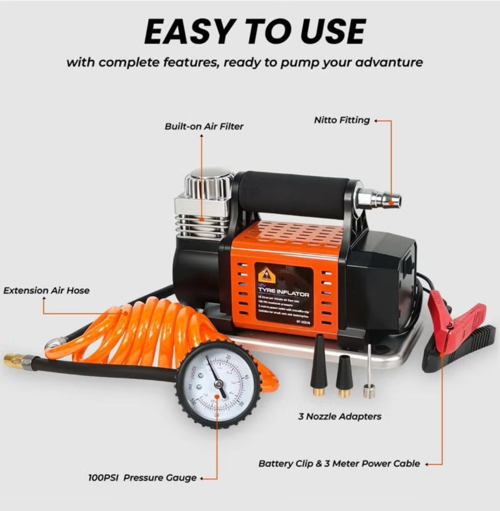 يتميز بتصميم عملي، عداد ضغط واضح، ووصلة بطارية مباشرة مع كيابل بطول 3 متر، ويجيك بكامل الملحقات وحقيبة للتخزين.